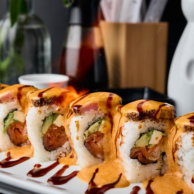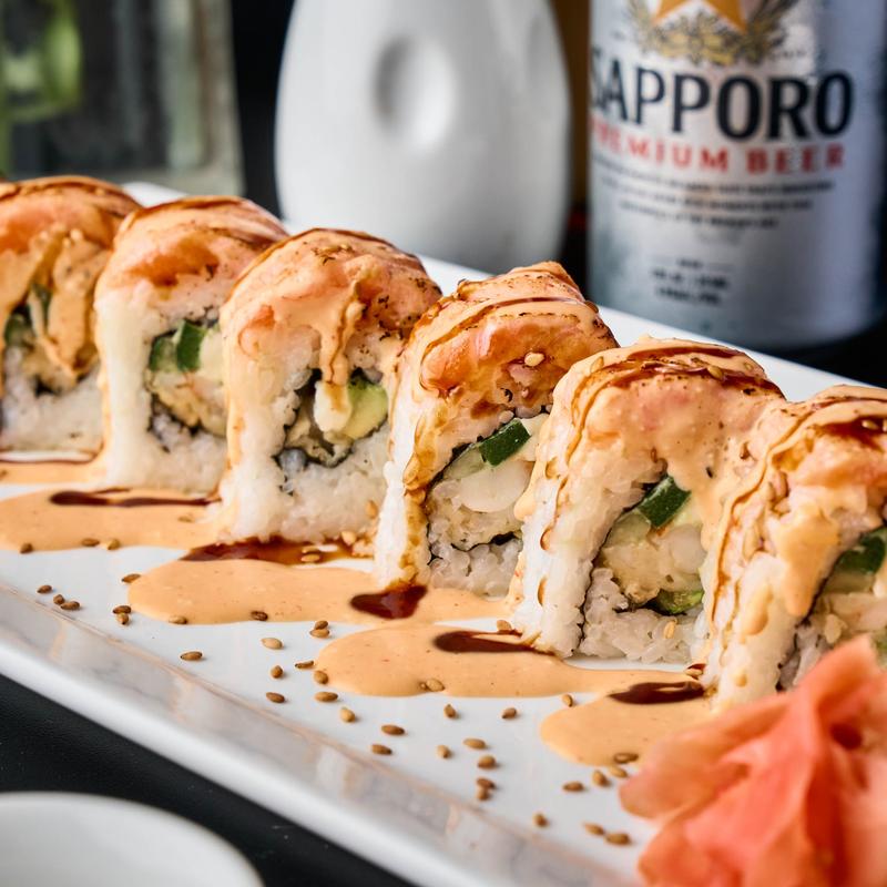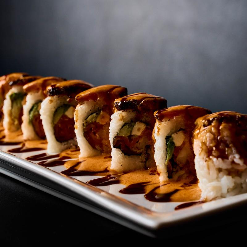 Shrimp tempura, avocado, cucumber, jalapeno, cream cheese, torched salmon, spicy mayo, eel sauce, sesame seeds