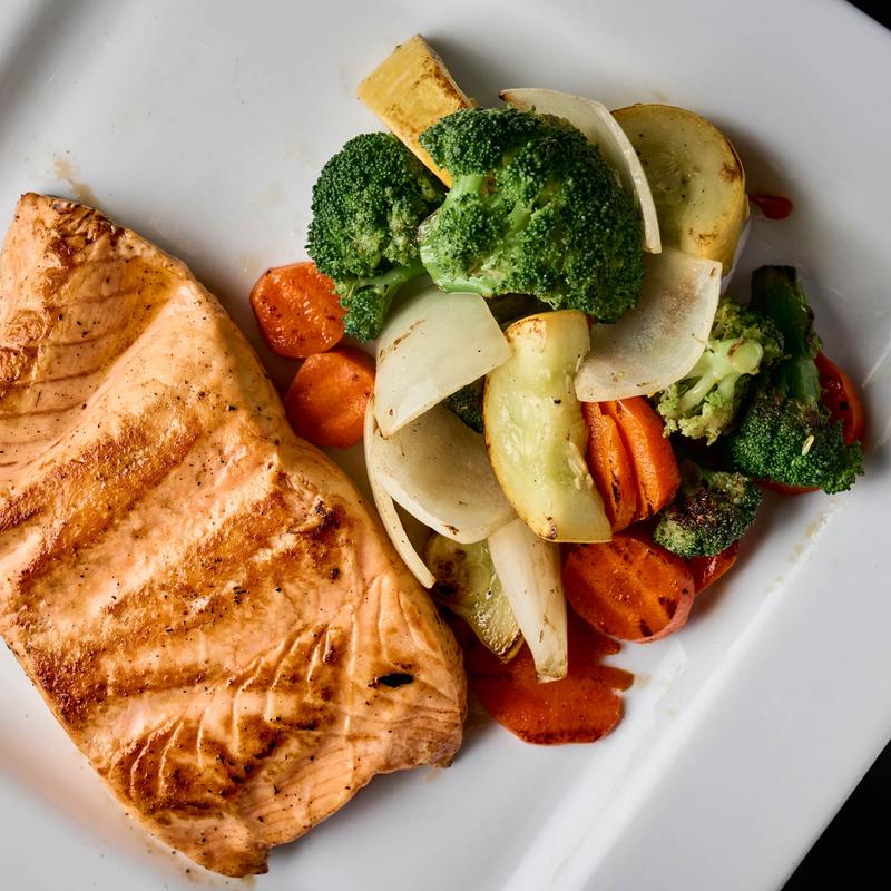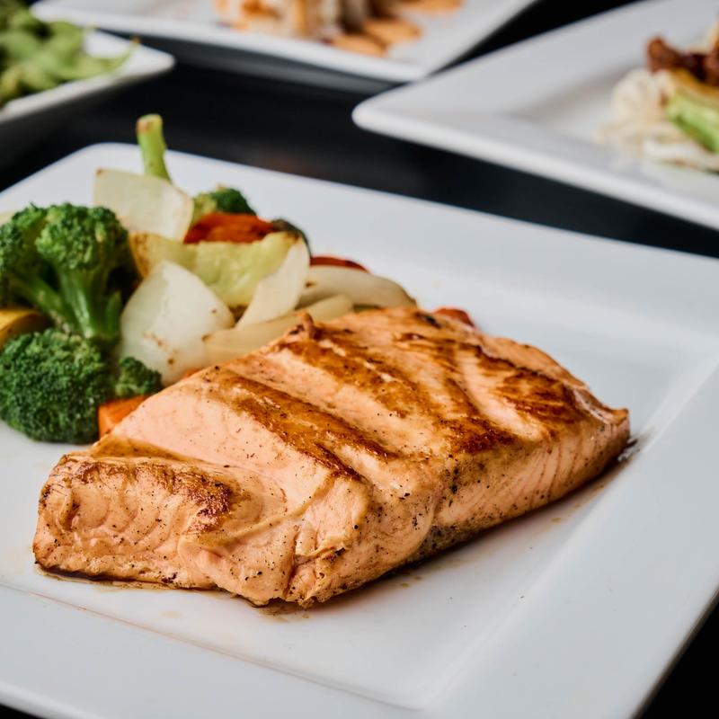 7oz of grilled salmon drizzled in a sweet glaze served with steamed broccoli & steamed rice