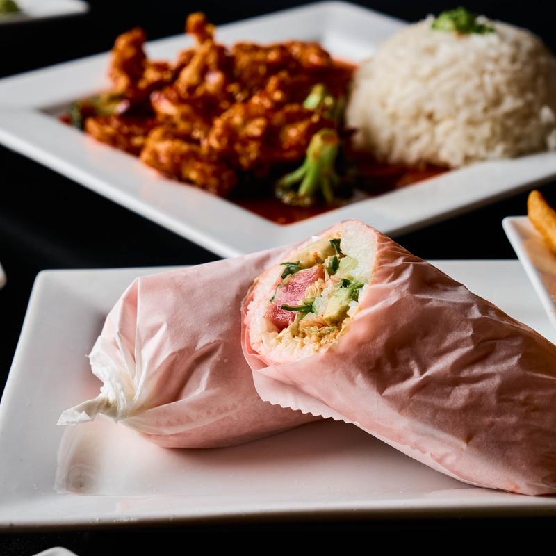 Your choice of tuna or salmon served with rice, avocado, lettuce, spicy mayo, unagi sauce, tempura flakes, all wrapped in soy paper & served with a side of Tokyo fries