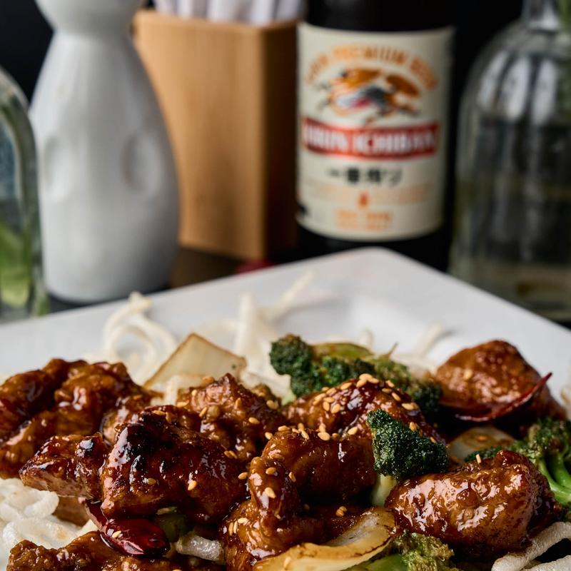 Sliced filet mignon, stir fry in house made Mogolian sauce served with green onions, broccoli, Szechuan pepper, crispy mai fun noodles, steam rice