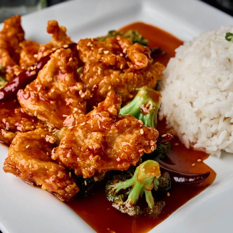 Hand battered and fried chicken tossed with a sweet glaze served with a side of steamed rice & broccoli